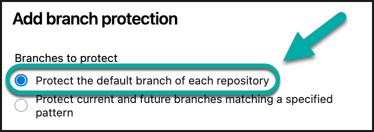 In the pop-up window, select “Protect the default branch of each repository” for the Branches to protect setting: