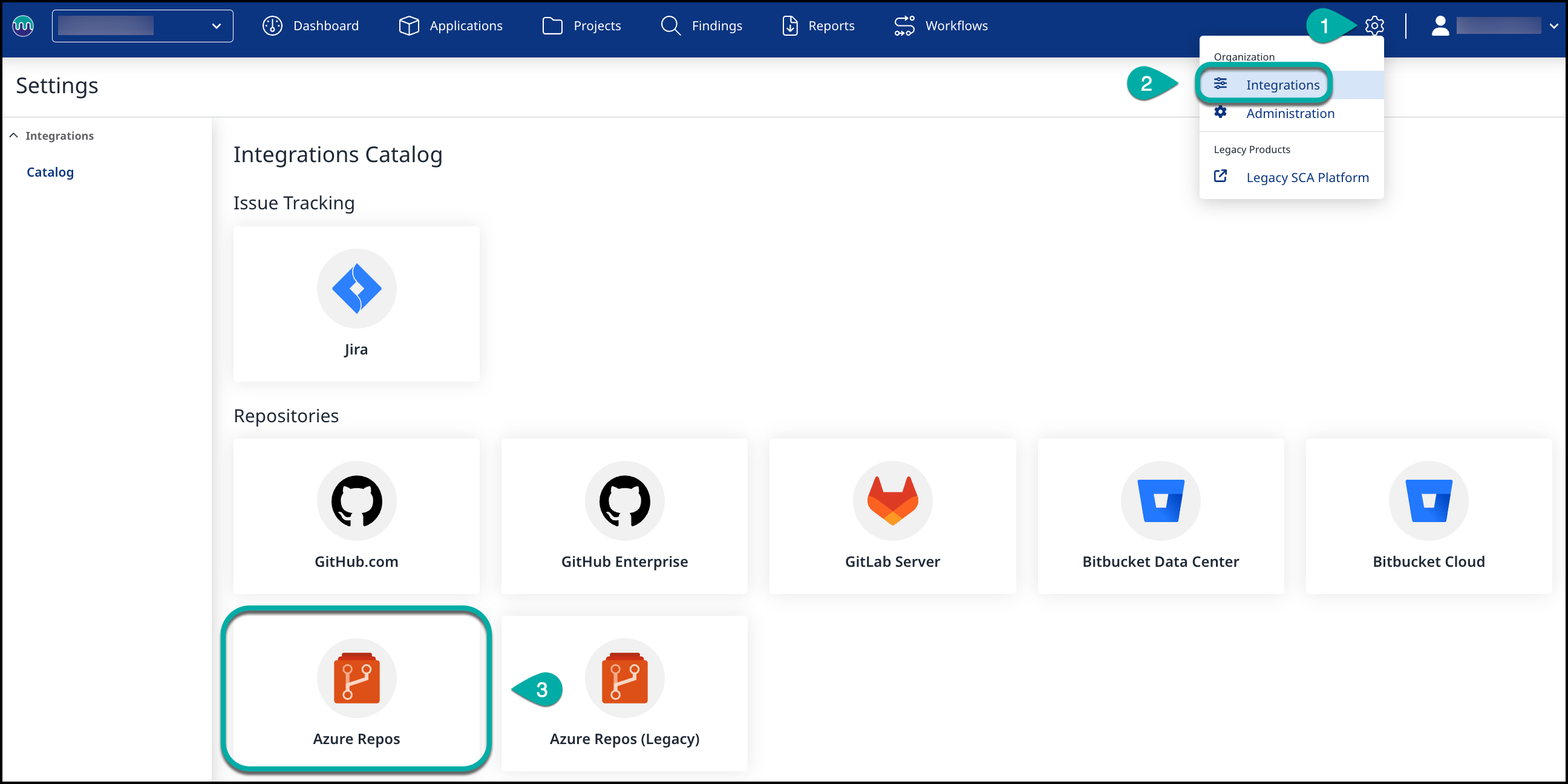 Open the Mend Platform and navigate to Integrations under the Settings toggle, then select the Azure Repos integration.