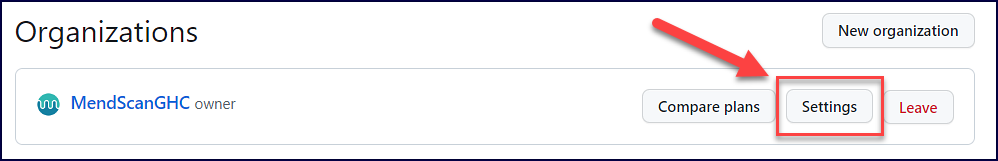 Within GitHub.com, navigate to Your organizations → select the Settings option of the organization integrated with Mend: