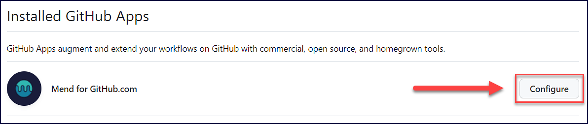 In the Installed GitHub Apps tab, find Mend for GitHub.com and click on Configure: