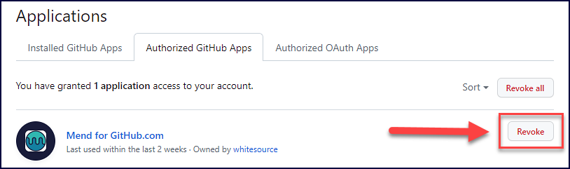 Optionally, go to the Authorized GitHub Apps tab, find Mend for GitHub.com, and click on Revoke: