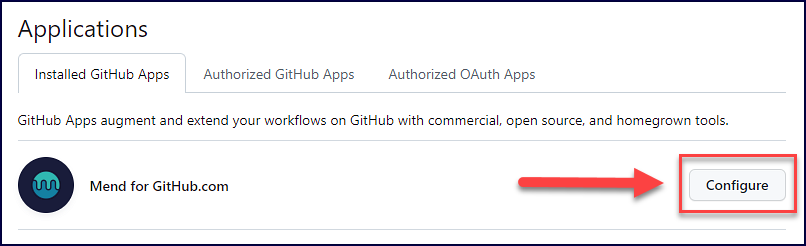 In the Installed GitHub Apps tab, find Mend for GitHub.com and click on Configure: