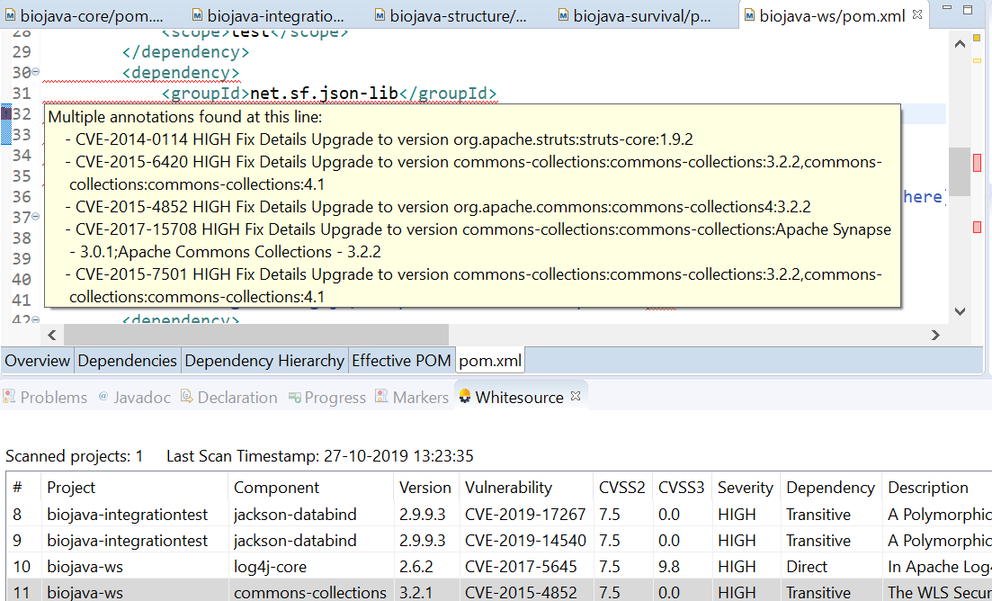• (For Maven projects only) To quickly display an analysis summary for a component in the pom.xml view, hover the mouse pointer over the code for the component in that view; a tooltip will be displayed, featuring both information and (depending on vulnerability attributes) links for applicable options, as follows: