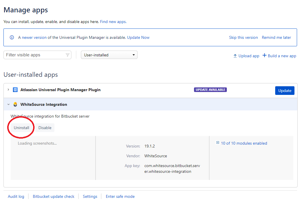 Select the Mend Integration app, and click on the ‘Uninstall’ button.