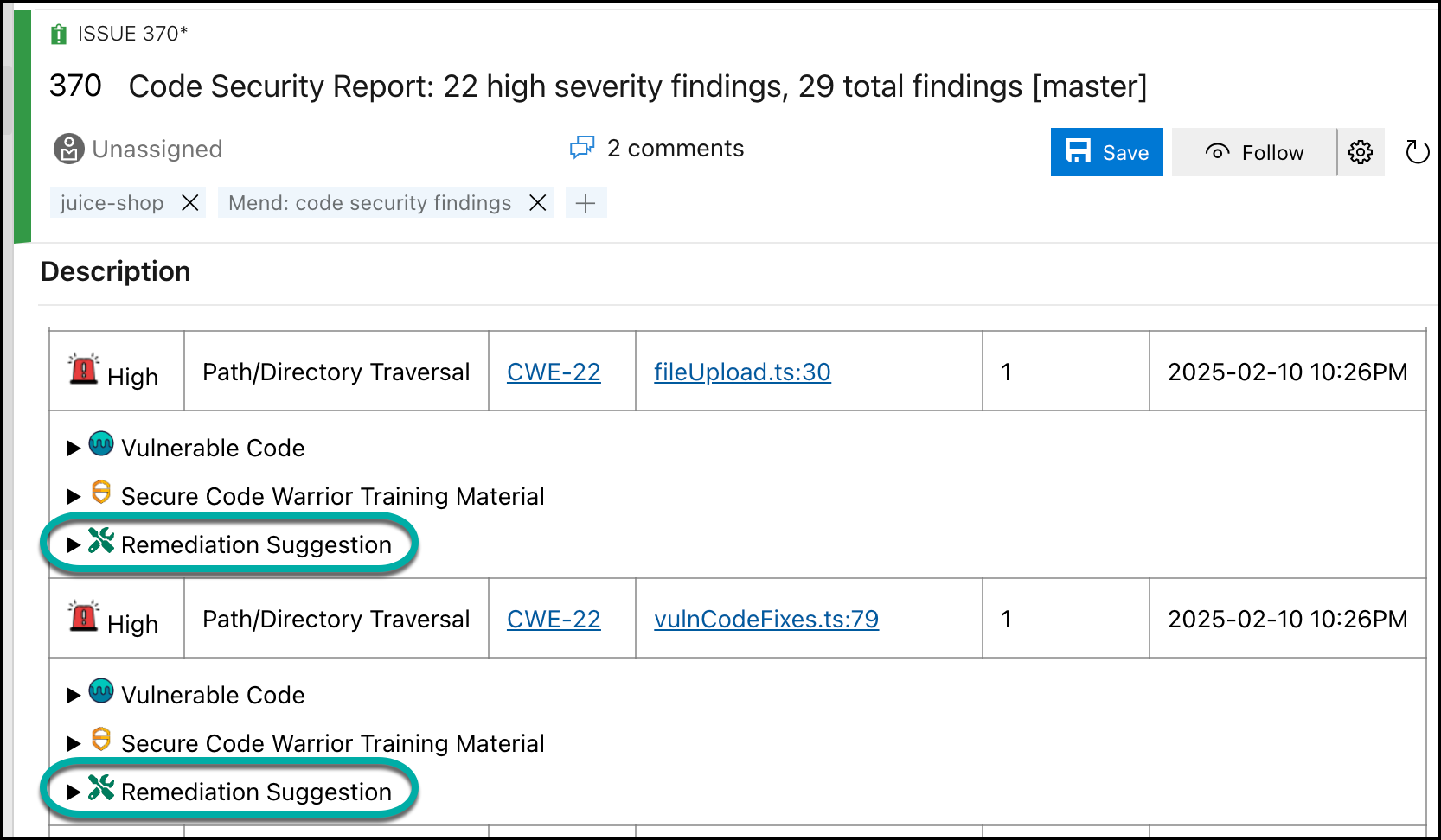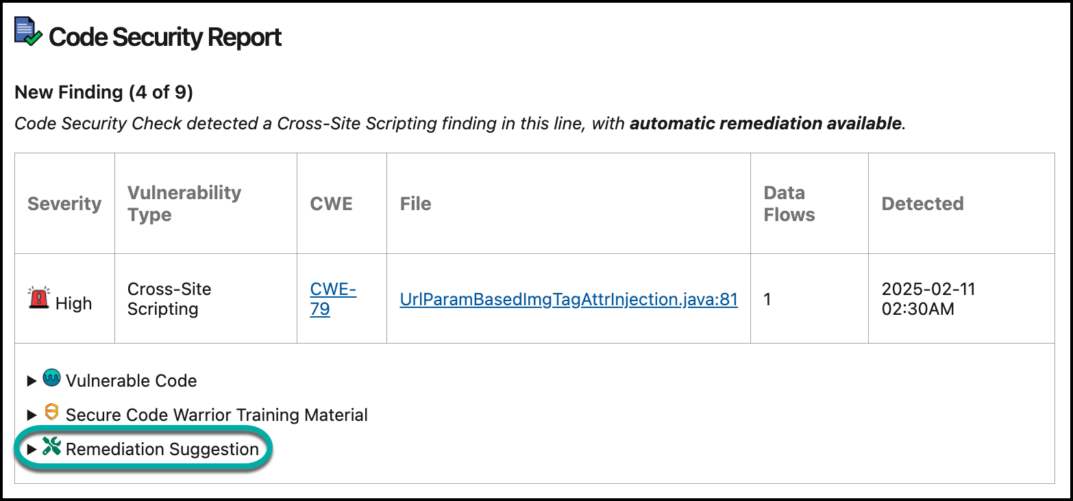 The remediation process is based solely on source code snippets related to your Code findings.