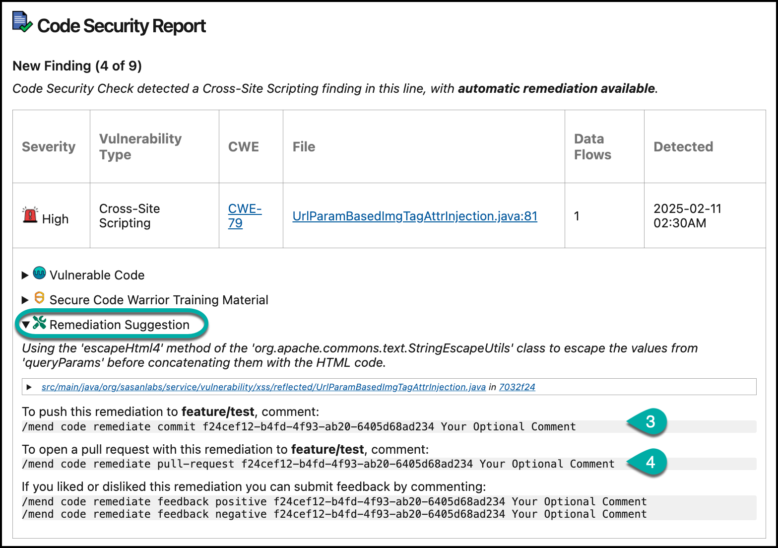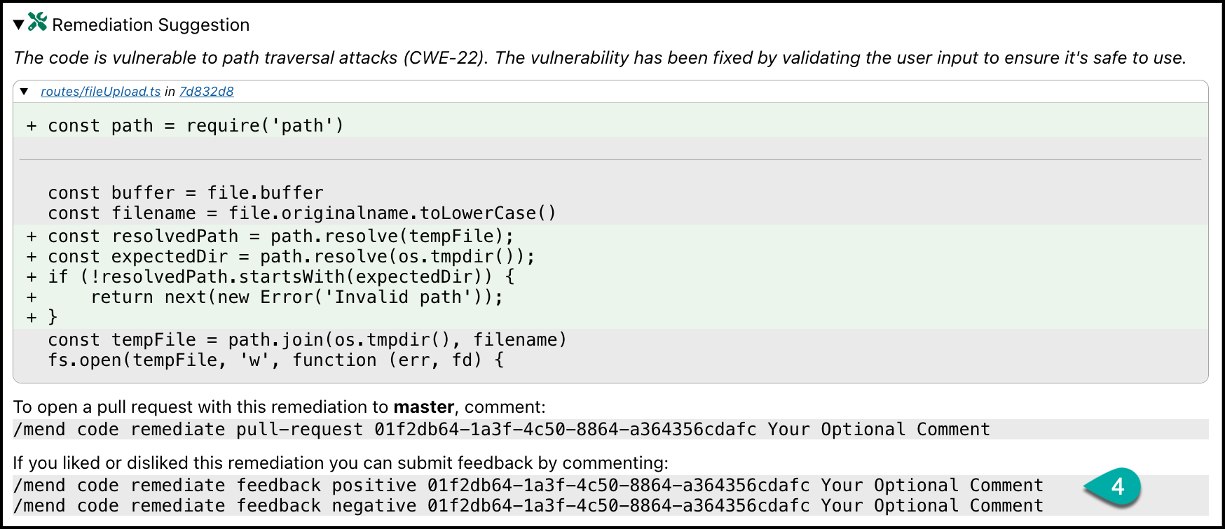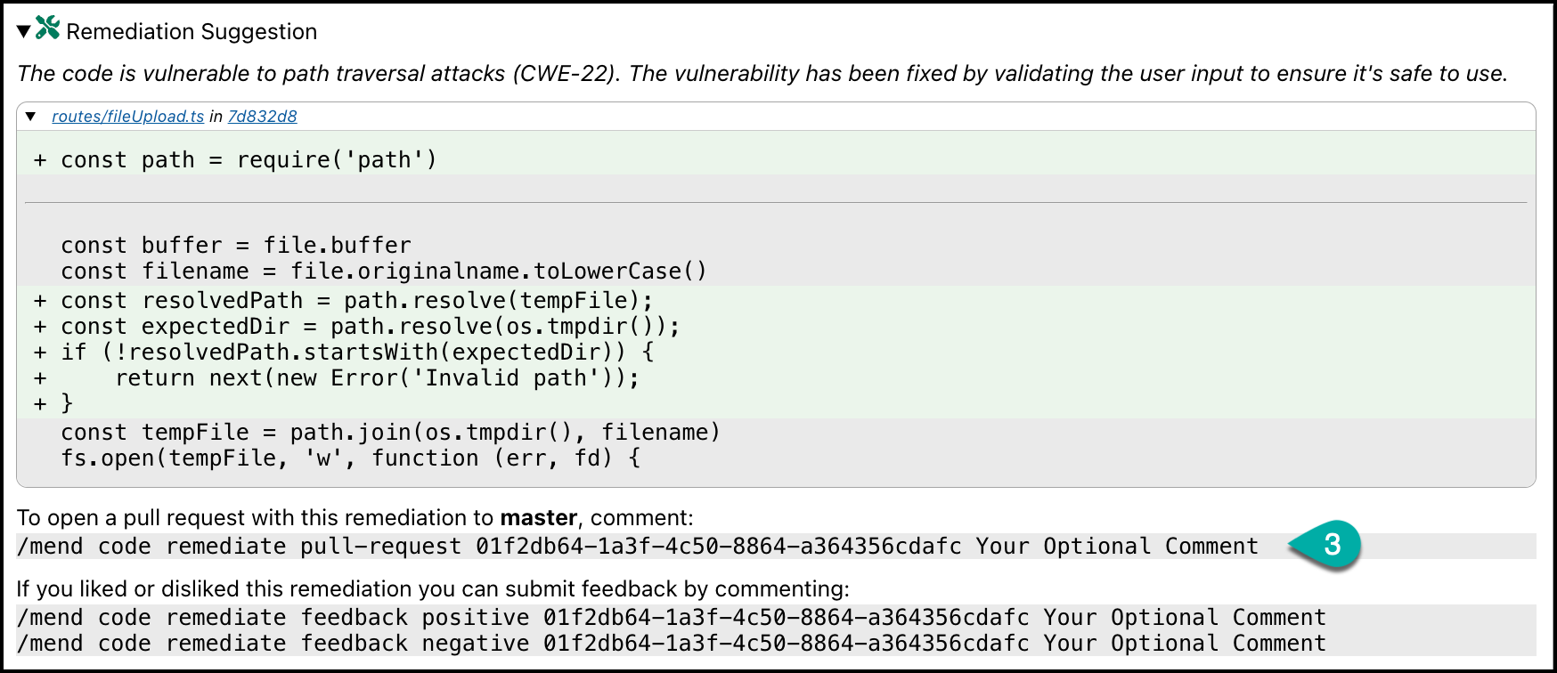 In this example:/mend code remediate feedback positive 01f2db64-1a3f-4c50-8864-a364356cdafc "Your Optional Comment"