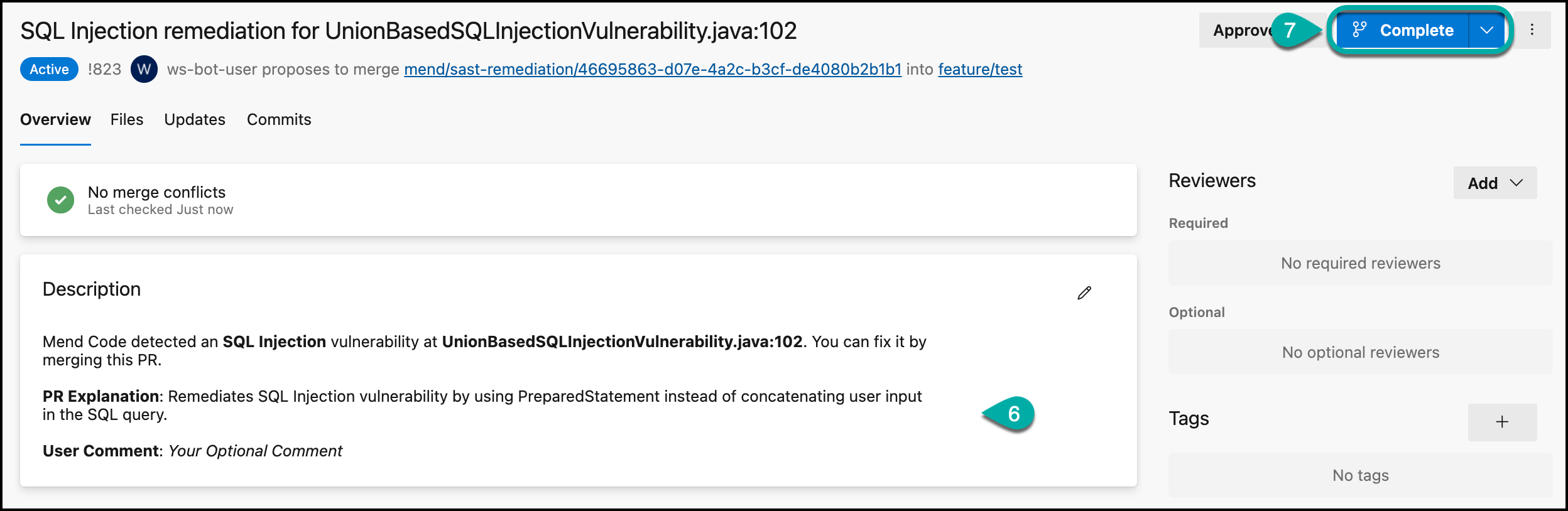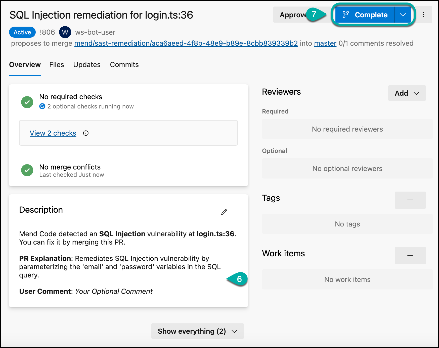 Click Complete to push the Mend code remediation to your branch. Mend recommends waiting for a completed Mend Code Security Check before pushing this PR into your relevant branch.