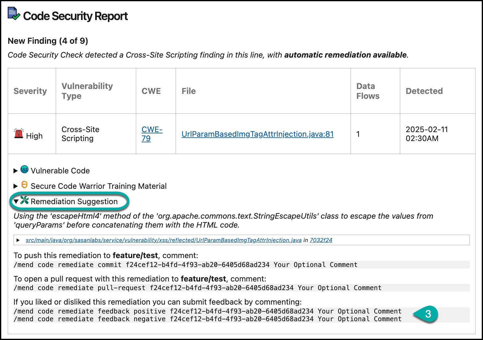 CODE/mend code remediate feedback positive <finding ID> "Your Optional Comment"