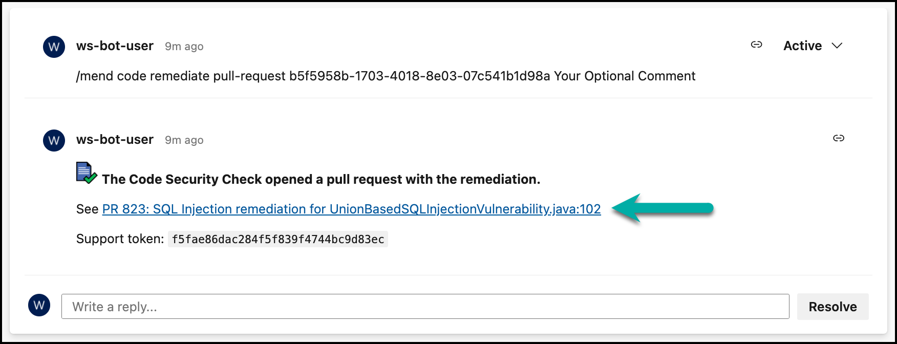 In this example:/mend code remediate pull-request 01f2db64-1a3f-4c50-8864-a364356cdafc Your Optional Comment
