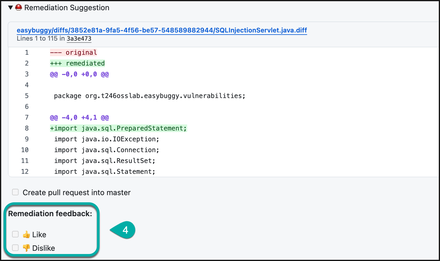 You can provide feedback on the provided remediation (Like / Unlike). This feedback is tracked but not used to improve the suggestions, as Mend is not sharing any customer code with the model.