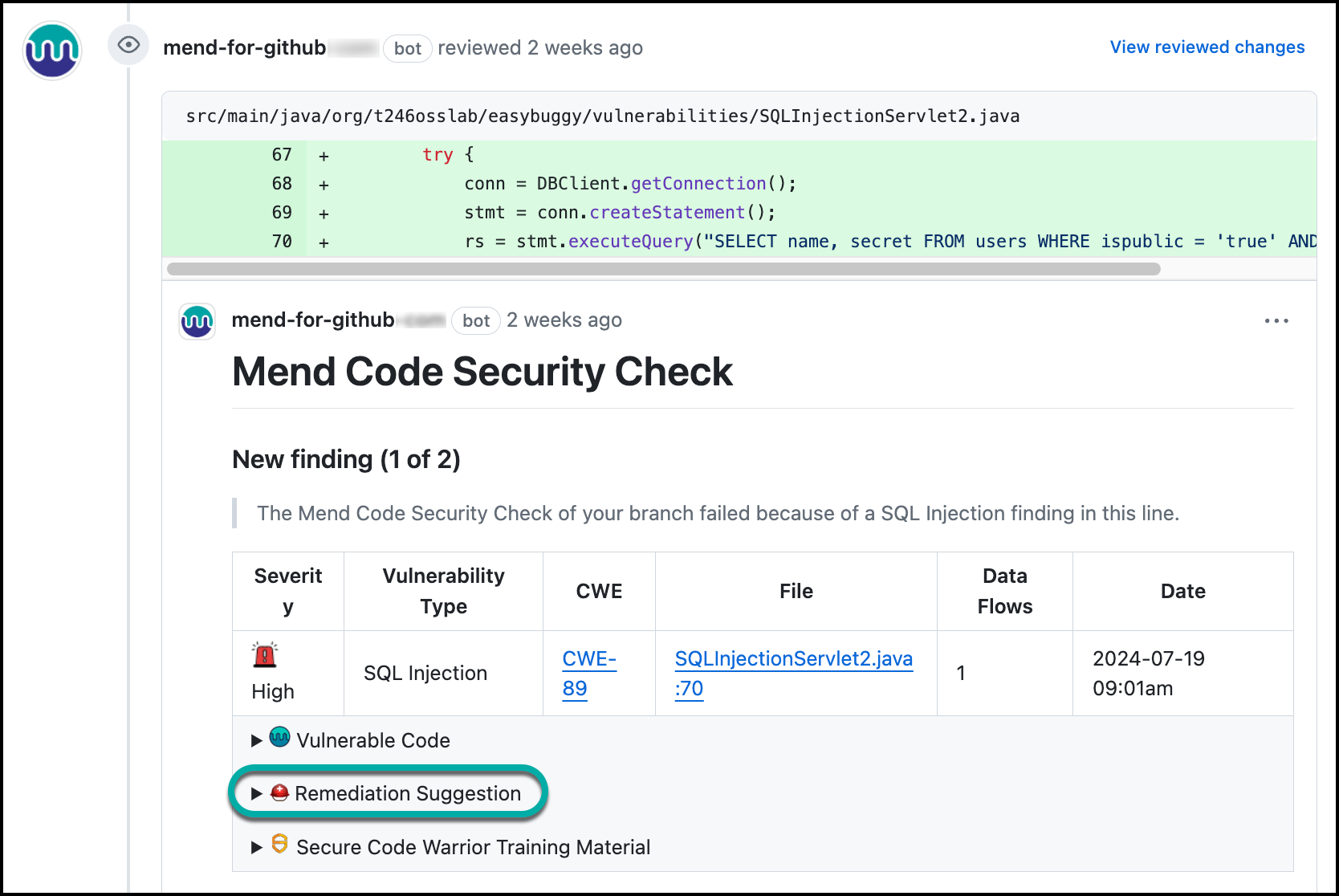 Once a Mend Code Security Check (SAST) has been completed in the repository, you can review the suggested remediations and create a Pull Request to implement the code fix.