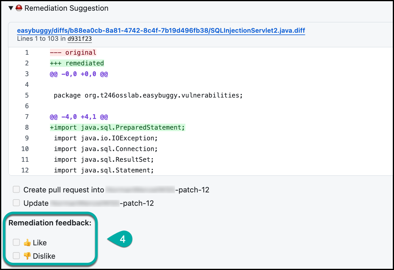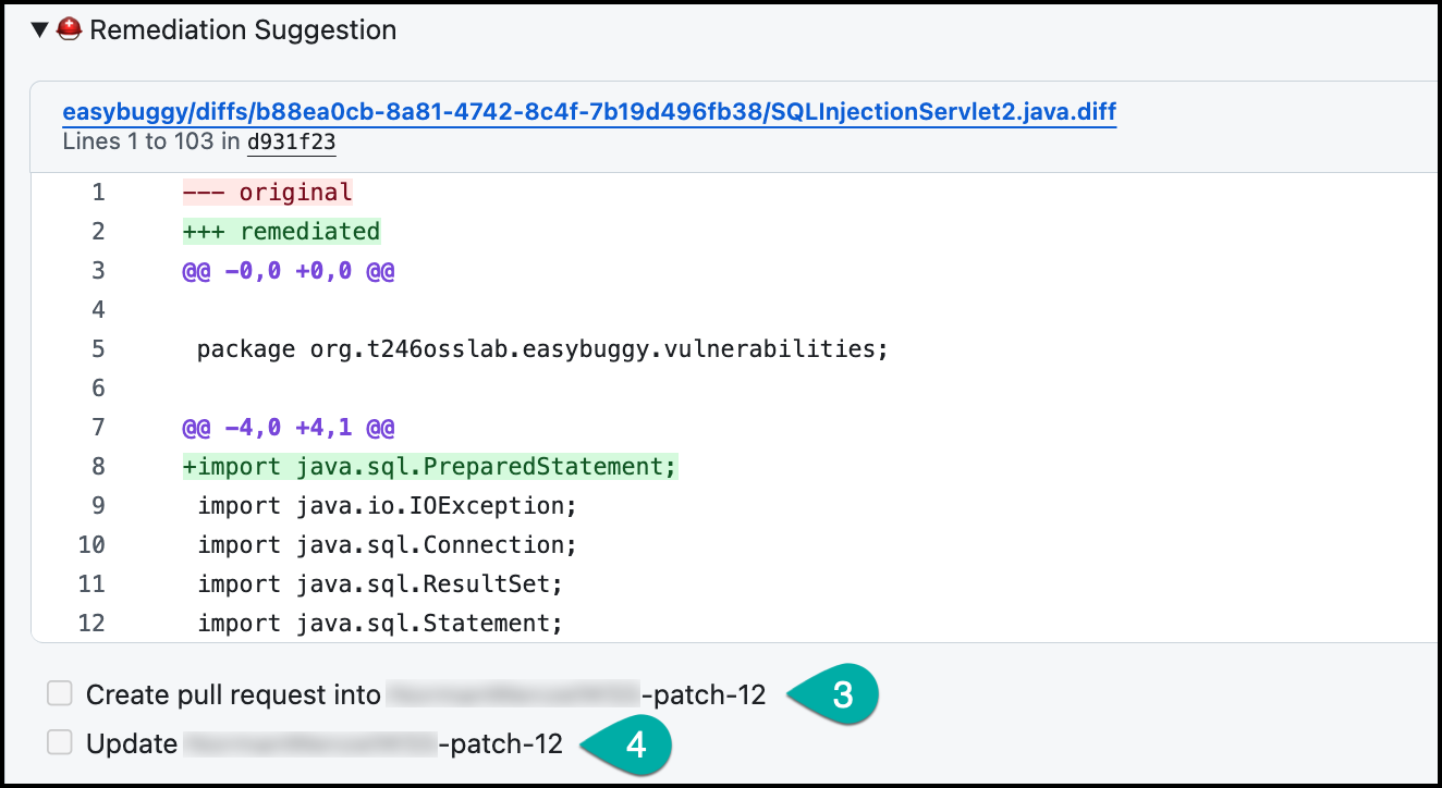 In case you would like to apply the suggested remediation, click on Create Pull Request.