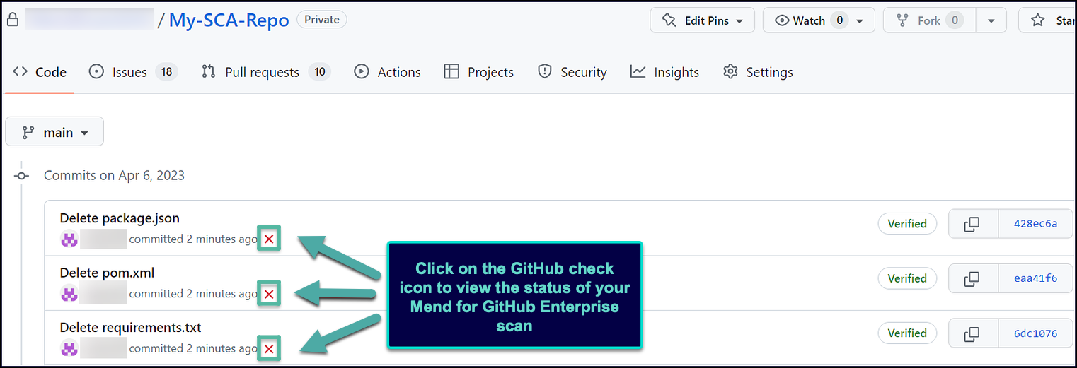 Within GitHub, in the Code > commits page of your repository, you can view the status and results of each scan. Click a specific check icon in order to view the Mend check:
