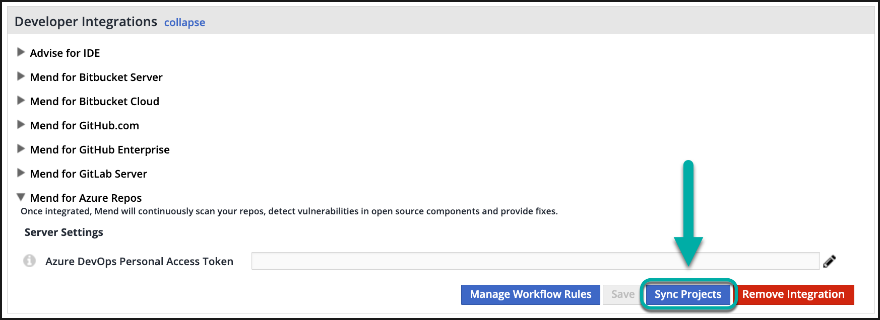 Sync your Azure project by going into your Mend UI → Integrations tab → Azure Repos → Sync Projects.