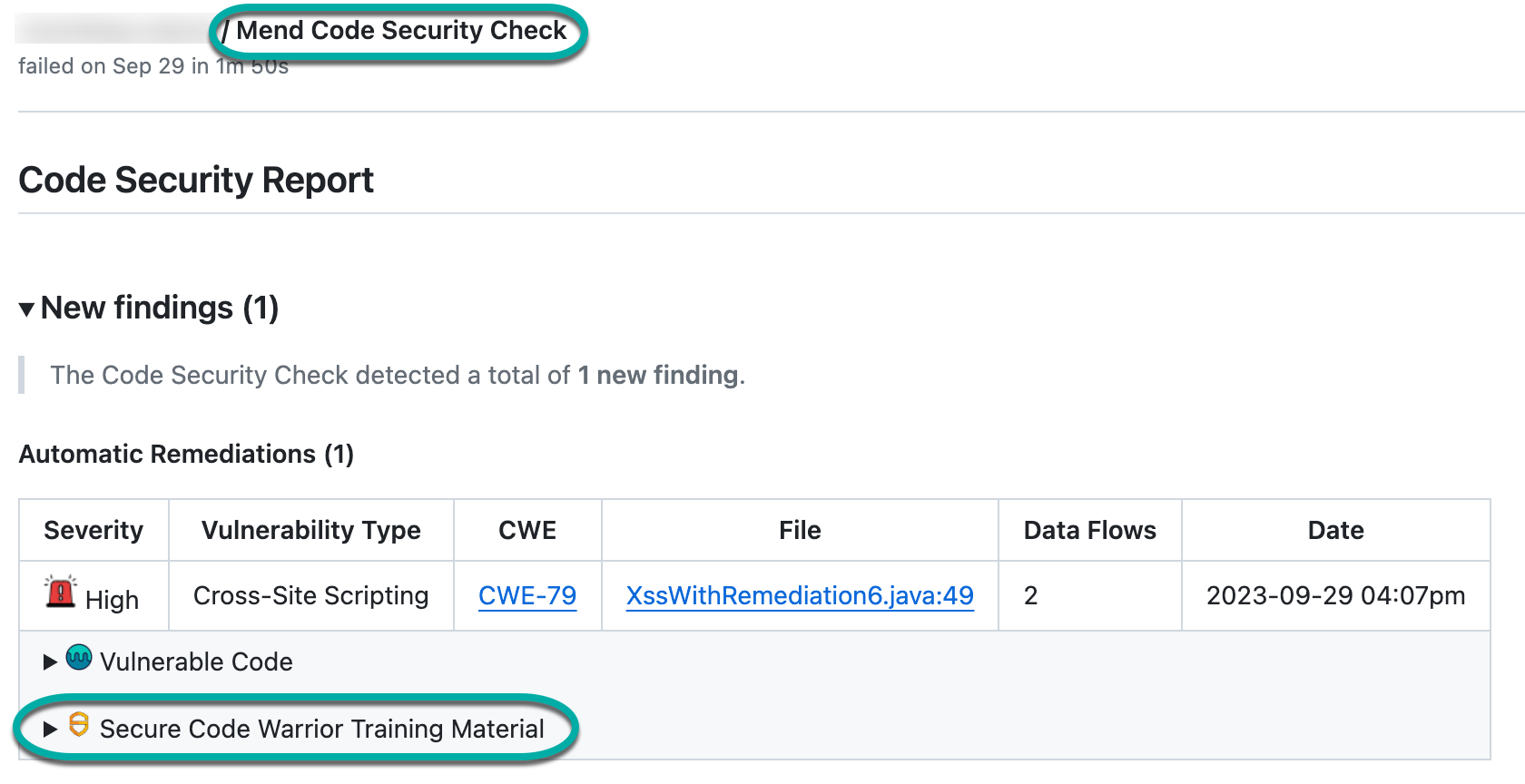 The Secure Code Warrior Training Material section can be found on both the Mend Code Security Check after a scan