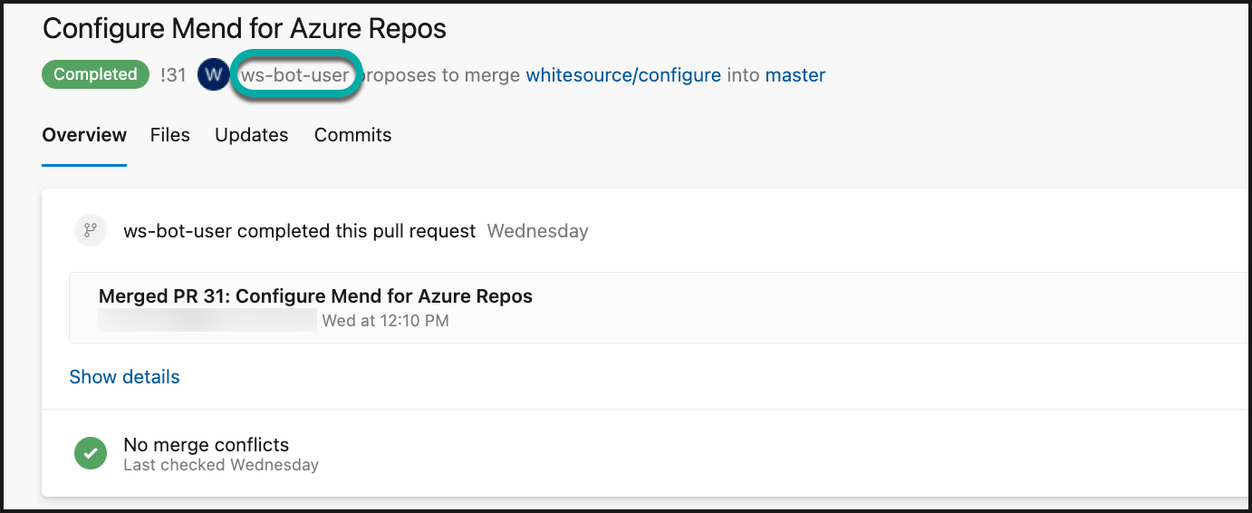 As noted previously, the bot-user does all actions of the Mend for Azure Repos in the integrated organization. Here are some examples: