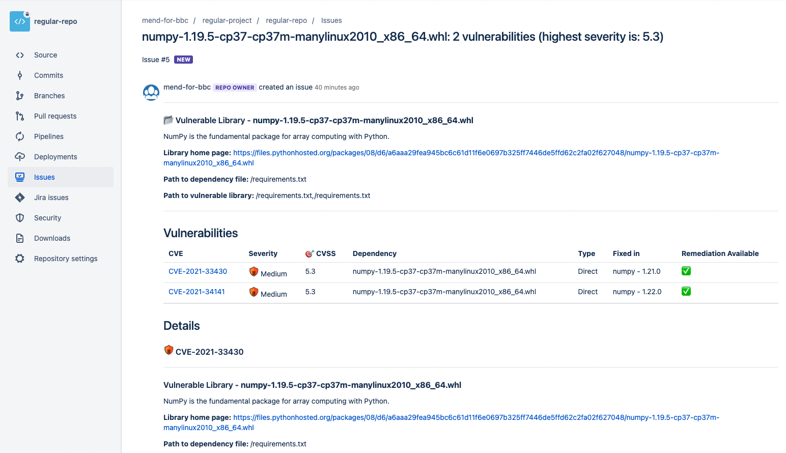 Issue: A link to the Mend issue that was generated for the vulnerability.