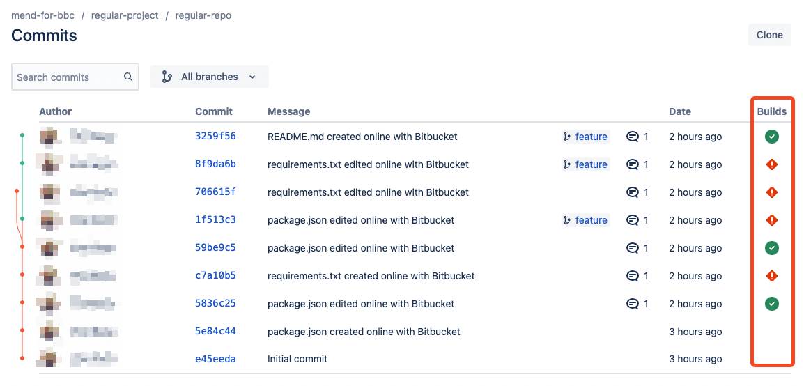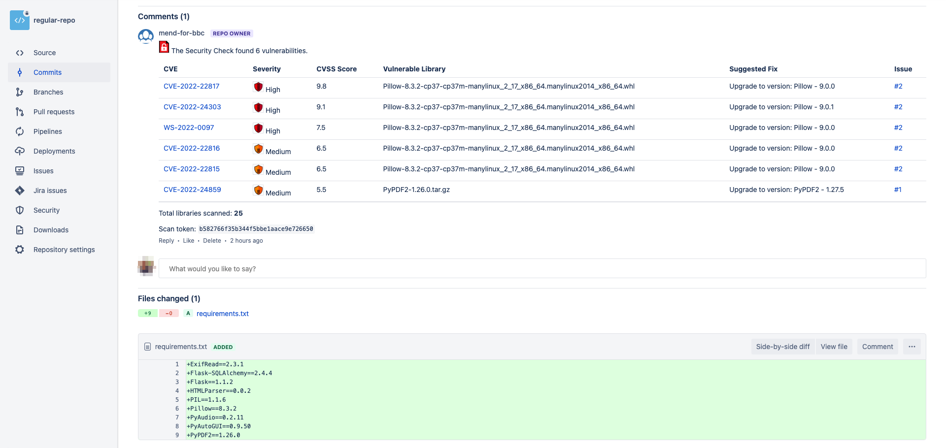 On the Commits page, you can view the status and results of each scan. Open a specific commit in order to view the Mend check.