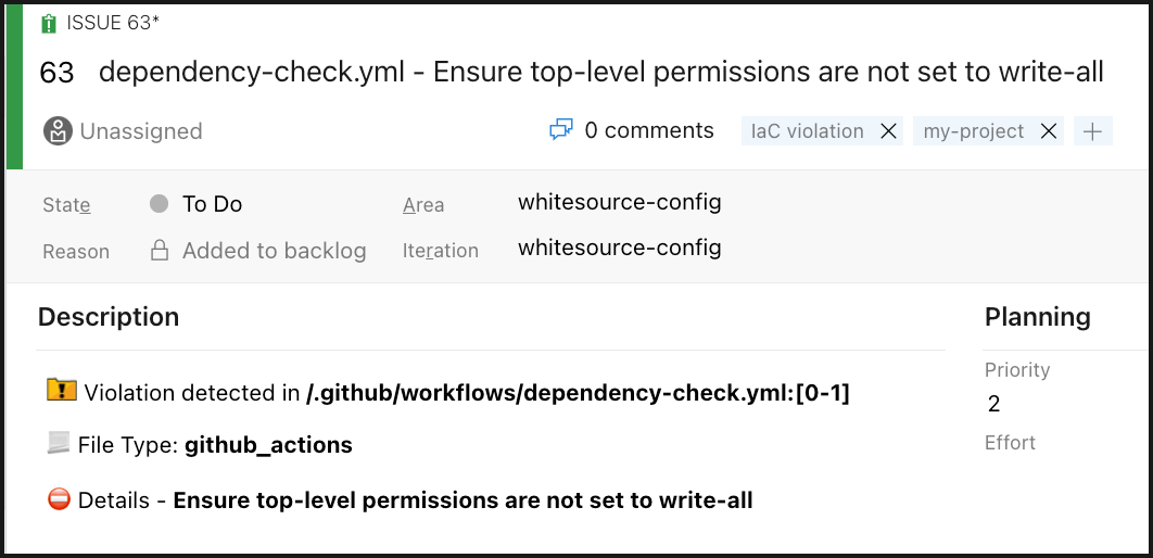 The Work Items section displays all the issues that Mend IaC Scan detected with the IaC Violation tag and a tag indicating a repository in which the issue was found. These proprietary labels indicate that a security vulnerability was detected by Mend.