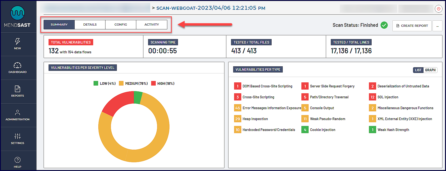 The Overall findings section provides the total count of findings as well as the direct link to the scan’s Details page within the Mend SAST application: