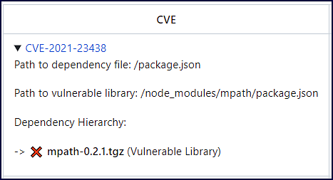 Vulnerable Library: Name of the vulnerable dependency file. Click on the dropdown arrow for more information. This information includes the path to the dependency file and the path of the library. If the path is of a transitive dependency, then only the path information of the root library is displayed. This section also contains a commit link, which includes the path to the commit link where the vulnerability was found.