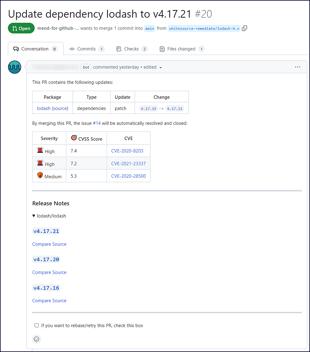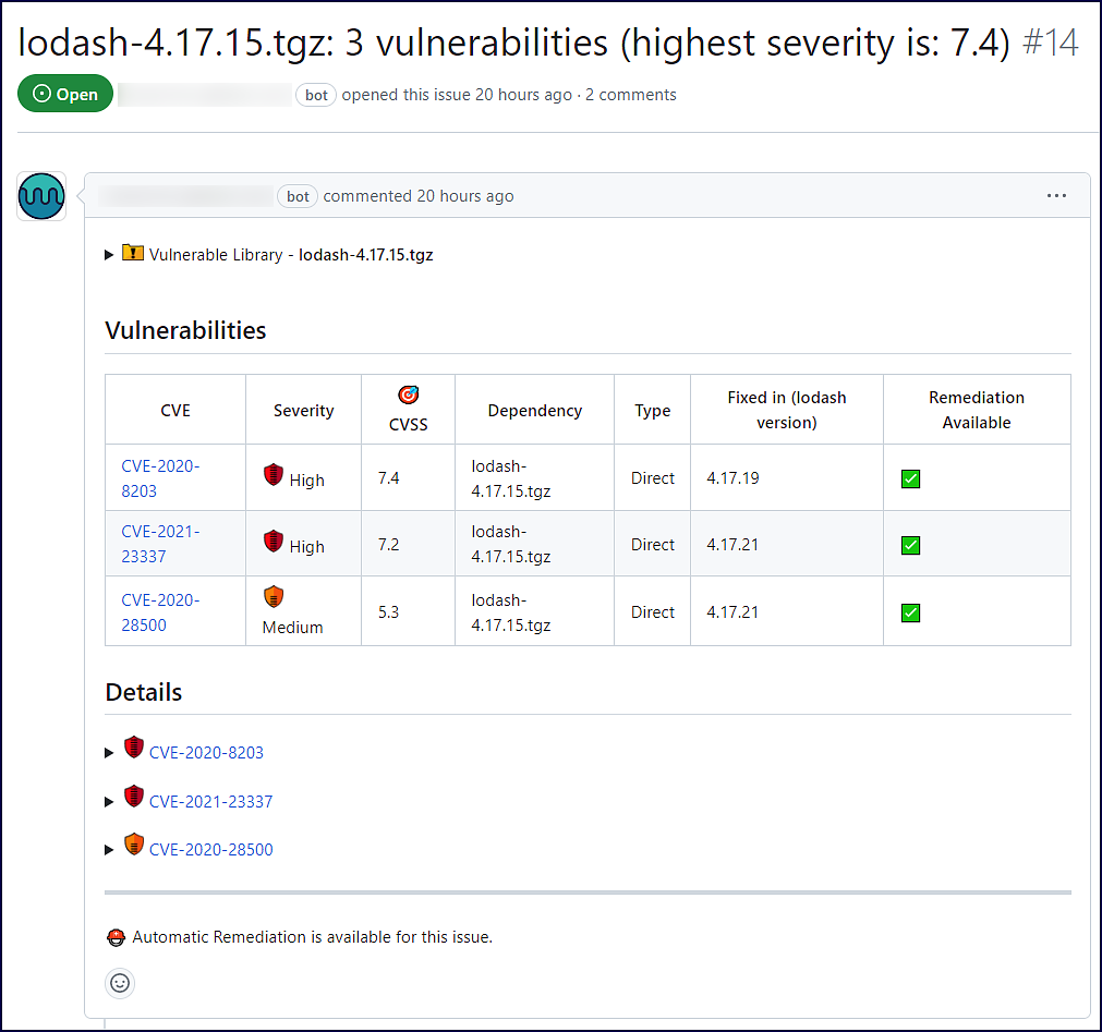 If Remediate is enabled, and remediation is available for an identified open-source vulnerability, a remediate branch called whitesource-remediate/<nameofcomponent>will automatically create a GitHub Pull Request with actions included in the commits to resolve the vulnerability: