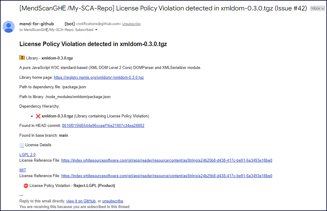 Once the Mend for GitHub Enterprise SCA scan is completed, if you have GitHub email notifications enabled for GitHub Issues, you will receive an email for each GitHub Issue created by the SCA scan: