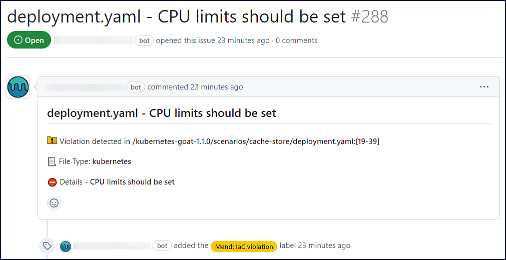 Once the Mend for GitHub Enterprise IaC scan is completed, the Mend IaC Check creates a GitHub Issue for each finding: