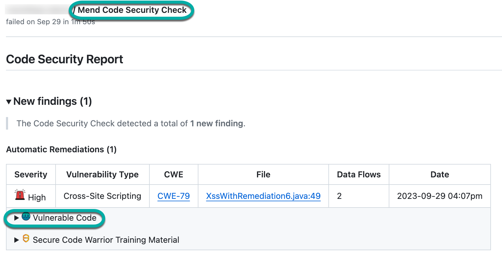 The Vulnerable Code section can be found on both the Mend Code Security Check after a scan