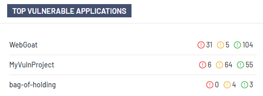 The top vulnerable applications card displays the vulnerability/severity counts from the latest application scans for the top 10 applications in your organization: