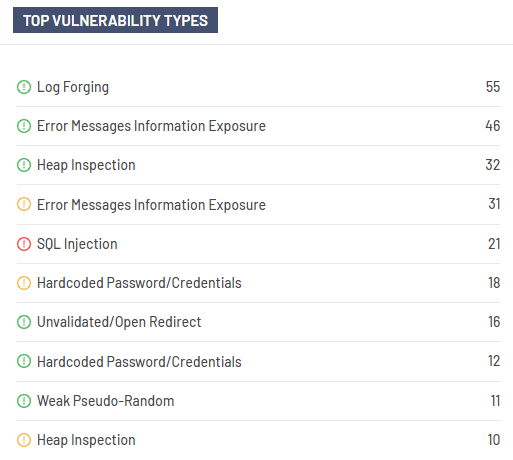 The top vulnerability types card displays the top 10 vulnerability types with vulnerability counts across all applications scans in your organization: