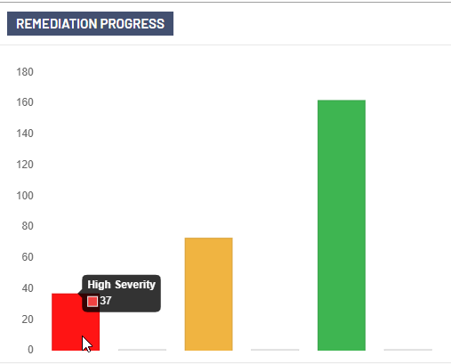 The remediation progress card displays the comparison between vulnerability severity counts discovered in your application baseline scans and the latest scans. Hovering over the bar chart will display the vulnerability severity level and count: