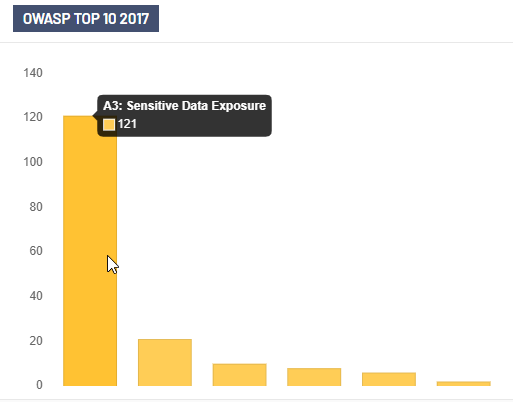 The OWASP top 10 2017 card displays the “OWASP Top 10 2017” violations with vulnerability counts from the latest application scans. Hovering over each bar within the graph will show you the ID, ID Description, and total count within your organization: