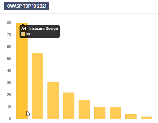 The OWASP top 10 2021 card displays the “OWASP Top 10 2021 ” violations with vulnerability counts from the latest application scans. Hovering over each bar within the graph will show you the ID, ID Description, and total count within your organization: