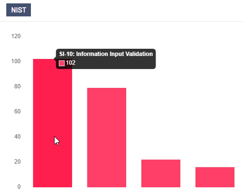 The NIST card displays the “NIST” violations with vulnerability counts from the latest application scans. Hovering over each bar within the graph will show you the ID, ID Description, and total count within your organization: