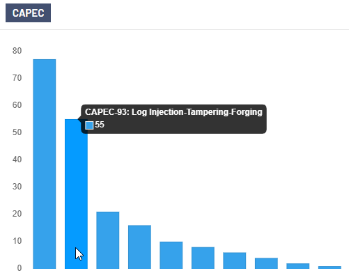 The CAPEC card displays the “CAPEC” violations with vulnerability counts from the latest application scans. Hovering over each bar within the graph will show you the ID, ID Description, and total count within your organization: