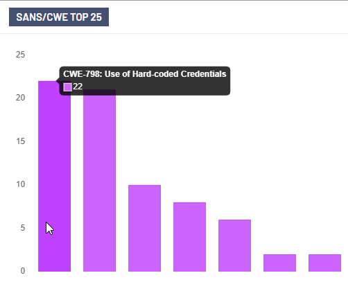 The SANS/CWE top 25 card displays the “SANS/CWE TOP 25” violations with vulnerability counts from the latest application scans. Hovering over each bar within the graph will show you the ID, ID Description, and total count within your organization: