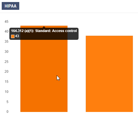 The HIPAA card displays the “HIPAA” violations with vulnerability counts from the latest application scans. Hovering over each bar within the graph will show you the ID, ID Description, and total count within your organization: