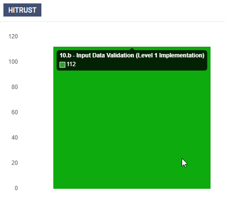 The HITRUST card displays the “HITRUST” violations with vulnerability counts from the latest application scans. Hovering over each bar within the graph will show you the ID, ID Description, and total count within your organization: