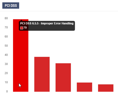 The PCI DSS card displays the “PCI DSS” violations with vulnerability counts from the latest application scans. Hovering over each bar within the graph will show you the ID, ID Description, and total count within your organization: