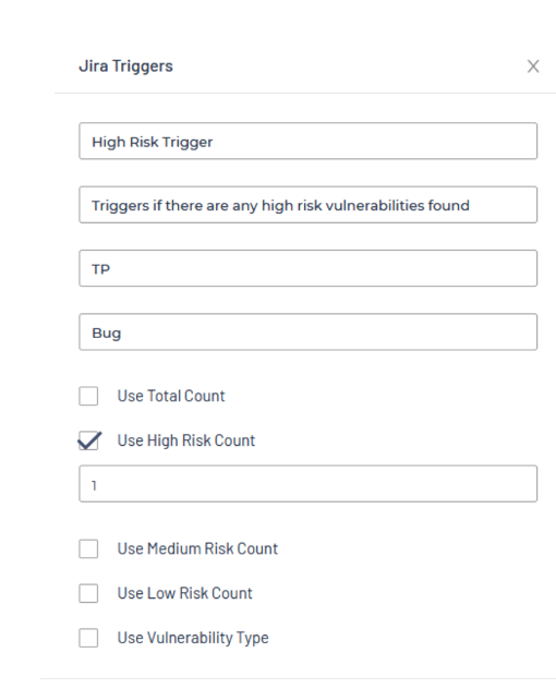 Triggers enable conditional submission of issues based on the results of a scan. When submitted, the issue will contain the summary of a scan and an attached technical HTML report. To add a new trigger, click on the +ADD button in the upper right corner of the triggers card. Once a trigger is configured and added, it can be used in a scan configuration. The following conditions are available: