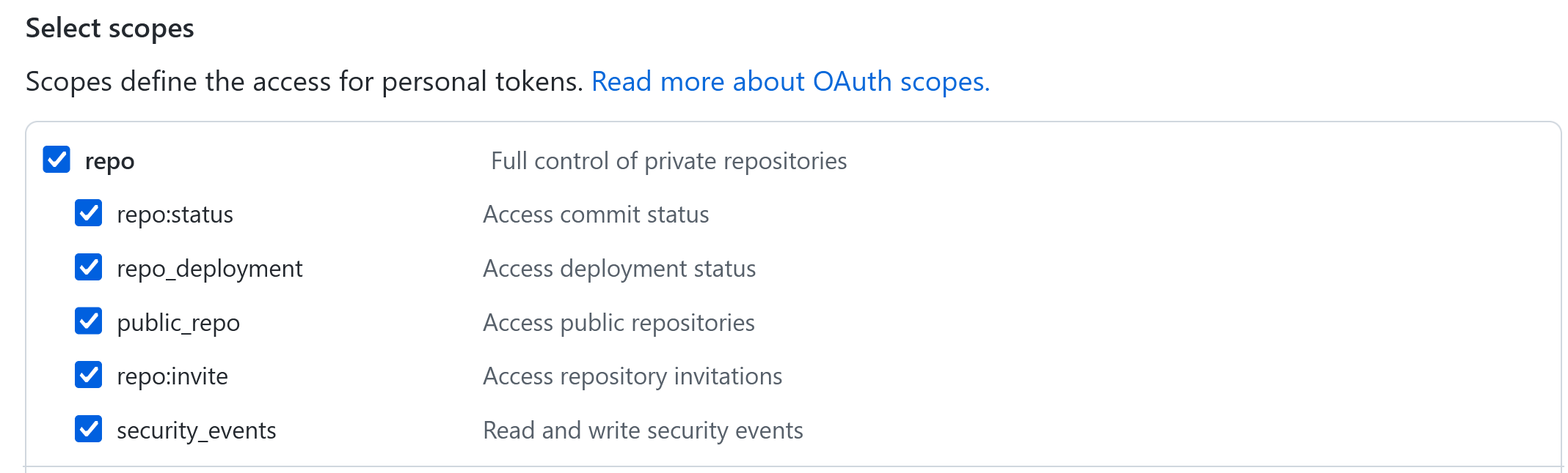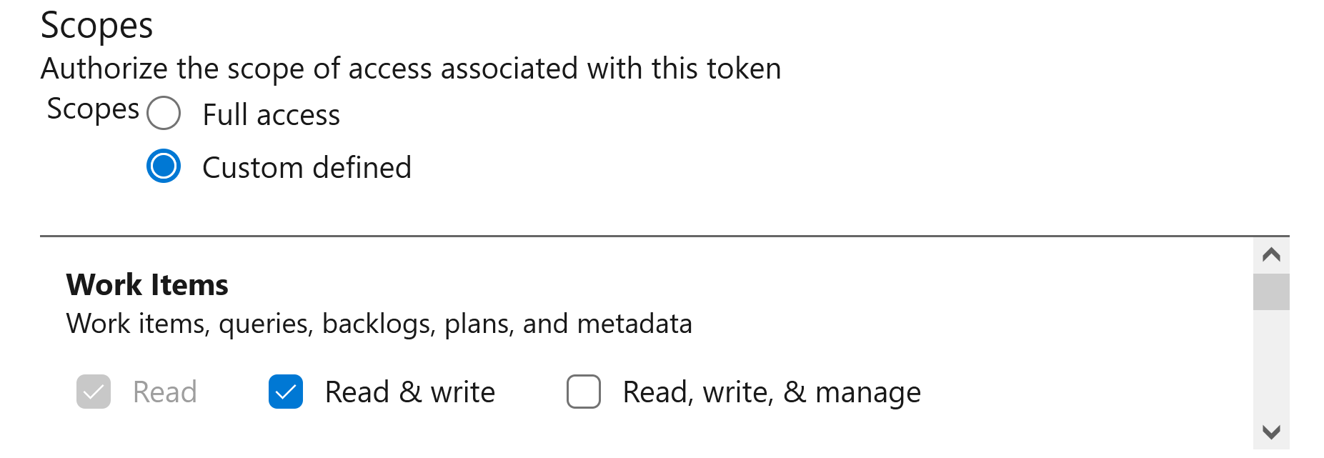 Permission requirements: The following scopes has to be defined with the Personal Access Token (PAT):