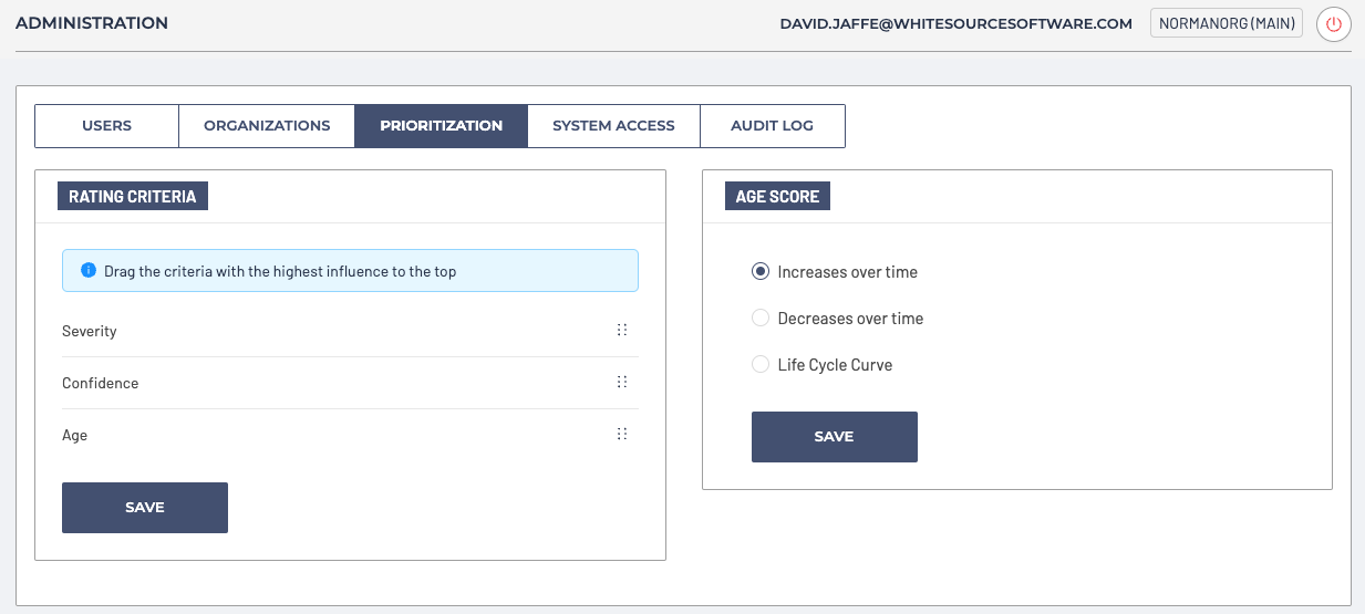 In the Prioritization tab, you can set the relative importance of three rating components: Confidence, Severity and Age, in the calculation of rating values. Drag a component up or down to set its importance, higher being more important and lower being less.