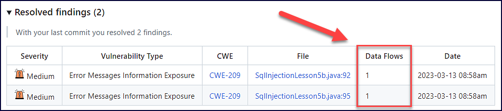 A “Data Flows” column and data flow information are now visible in the “Mend Code Security Check” New and Resolved findings sections: