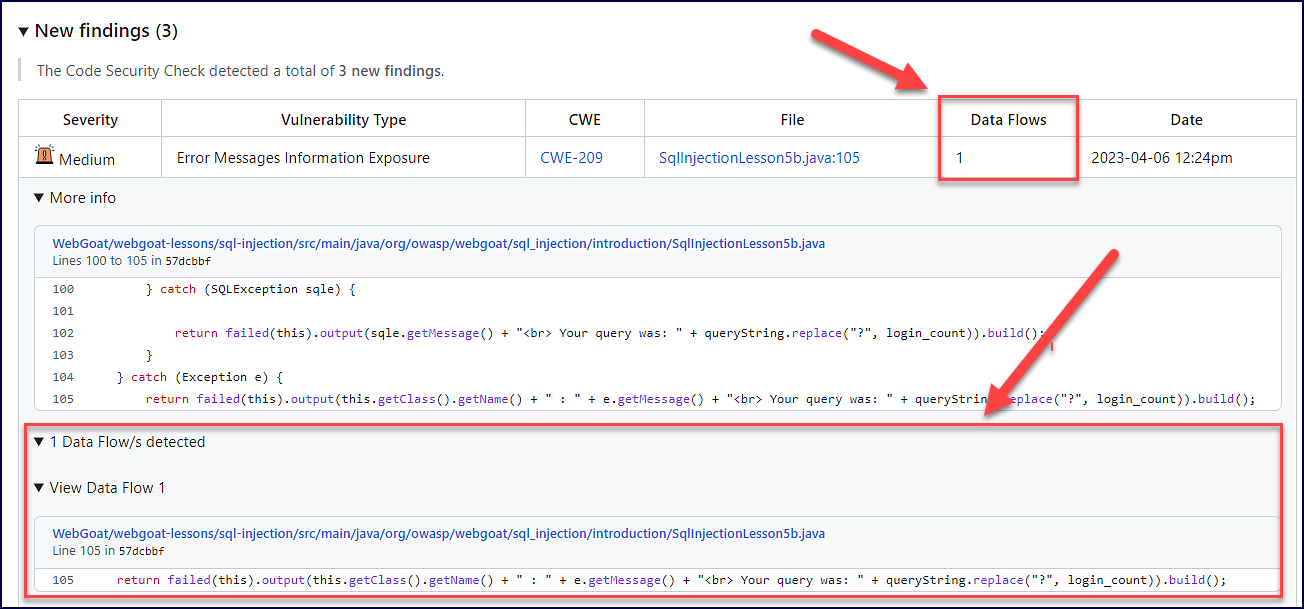 A “Data Flows” column and data flow information are now visible in the “Code Security Report” Issue Most Relevant Findings section: