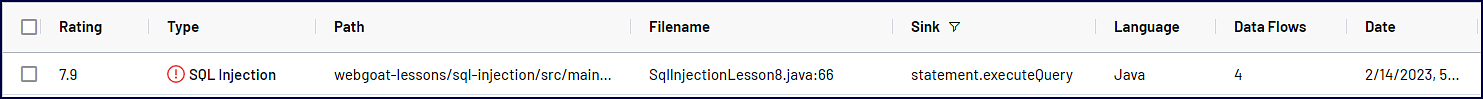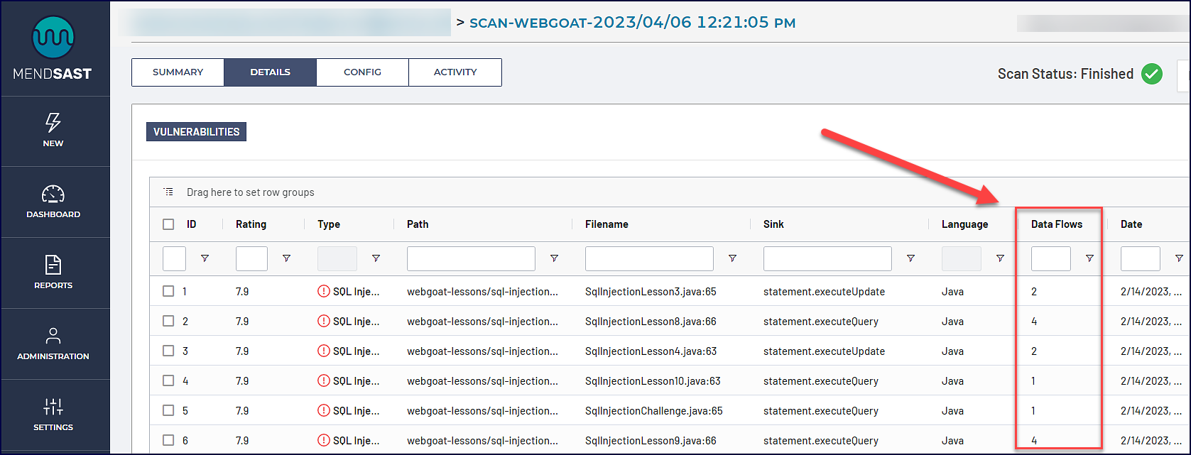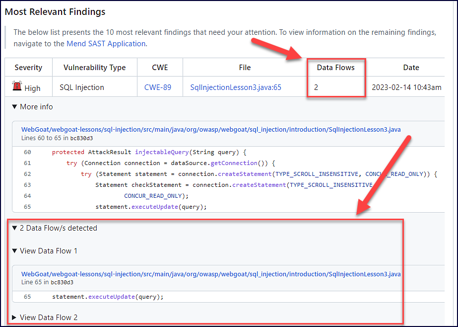 After scanning WebGoat with Mend SAST, the results will appear in the Mend SAST Application. Let’s review the SQL Injection finding below that is impacted by 4 data flows: