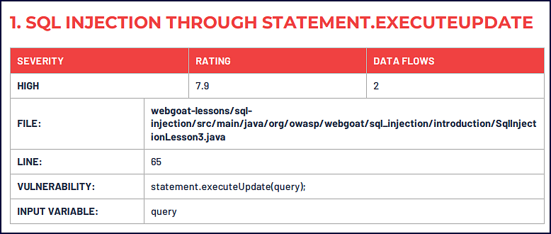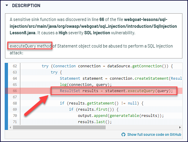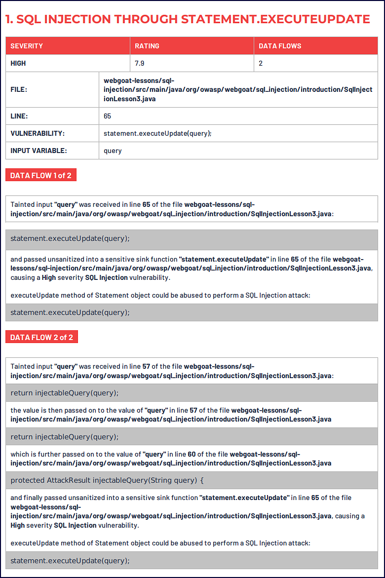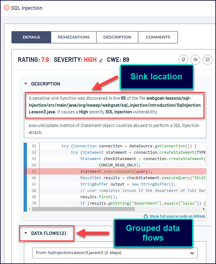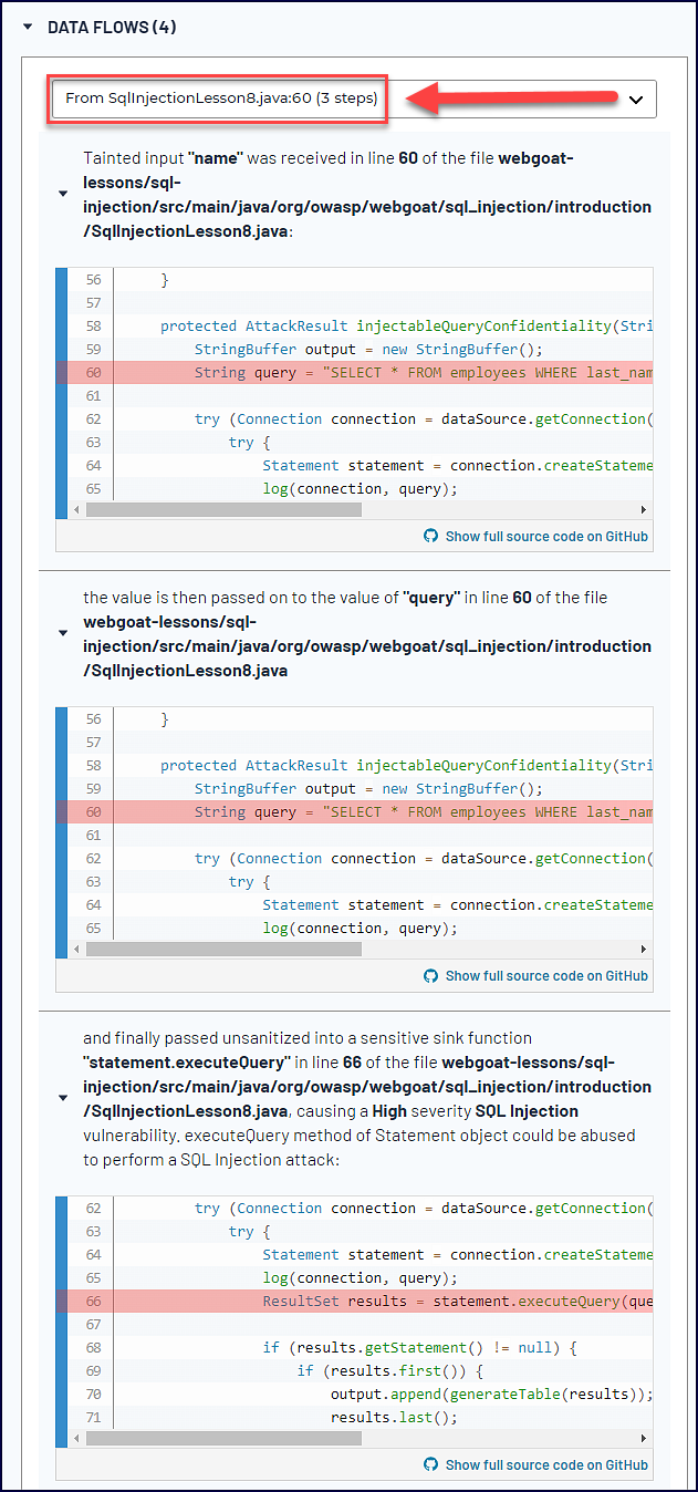Pulling the details, we can look at each data flow’s source and the steps the tainted input takes to get to its destination. For example, see one of the data flows below with a source location of SqlInjectionLesson8.java.60: