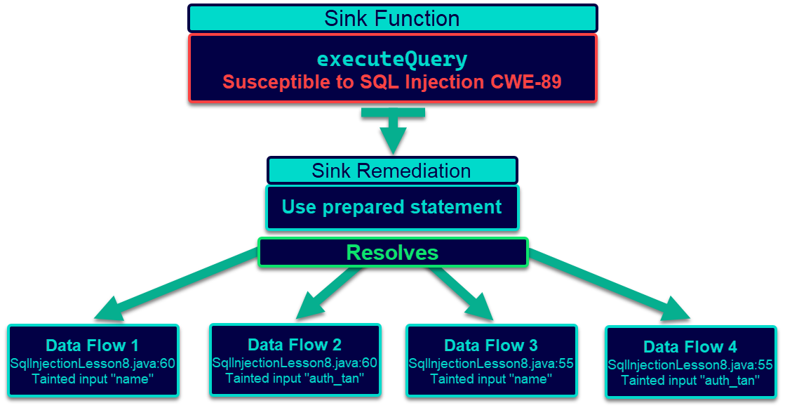 Remediating the executeQuery method (sink), e.g. by using a prepared statement instead, will address all 4 data flows: