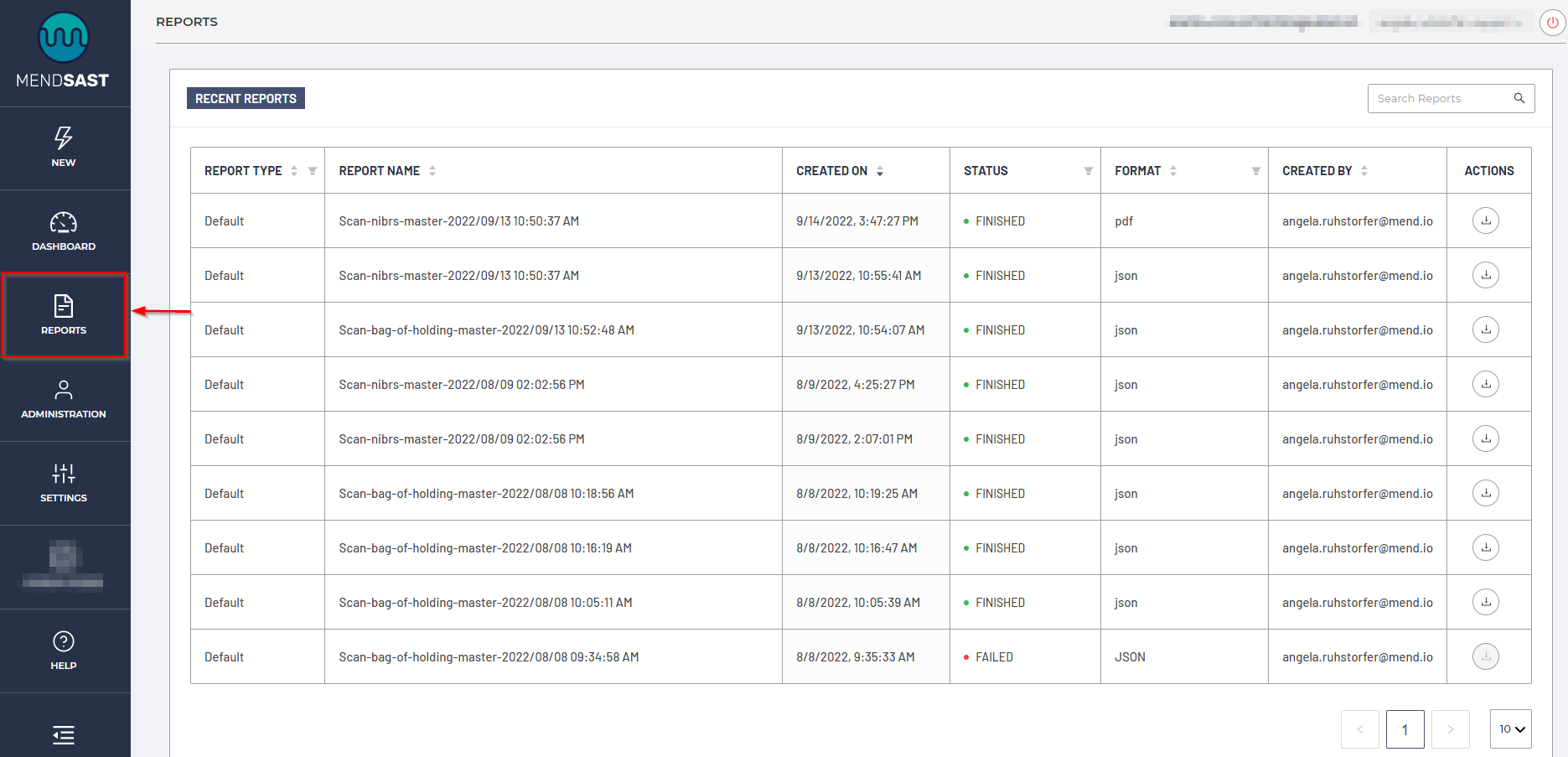 The Reports dashboard includes a history of reports that have been generated within your organization.