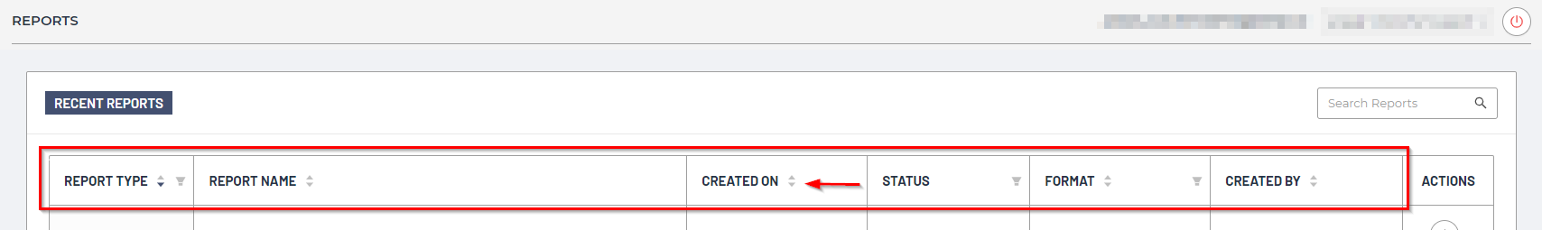 To sort by any of the columns, click on the column header (Report Type, Report Name, Created On, Status, Format, Created By):